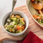 - Shred rostisserie chicken (you will need 1 chicken for this recipe) and place in a 3 quart casserole dish with the broccoli and chopped red peppers.