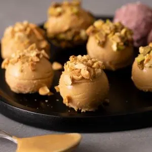 - Using ½-ounce silicone molds, portion 1 tablespoon of dough (about 14 grams) into 8 wells. Place in the freezer until solidified, about 30 minutes. Pop the bites out of the mold and set aside at room temperature for 10 minutes. Chop either 11 grams of pistachios or peanuts (optional) or mix together 2 grams (1/2 teaspoon) beet powder with 6 grams confectioners erythritol (2 teaspoons) (also optional). Roll the tops of the bites in the chopped nuts or sweetened beet powder.
