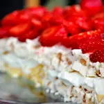 - Spread half of the cream cheese mixture over biscuit pieces and top with 1 cup strawberries. Repeat.