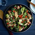- Remove the chicken from the marinade and discard marinade. Add to the onion mixture and stir-fry until the chicken is almost cooked through, about 3 minutes. Remove from heat and place on a plate. Coat the same pan with 1 teaspoon of peanut oil/ canola oil; set over medium-high heat. When hot, add the red bell peppers and broccoli. Cook, stirring occasionally, until broccoli is crisp-tender about 5 to 7 minutes.