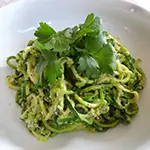 - Toss the warm zucchini with the pesto, sprinkle with the crushed red child pepper flakes (optional) and divide into pasta bowls. Season with additional salt and pepper to taste. Serve immediately.
